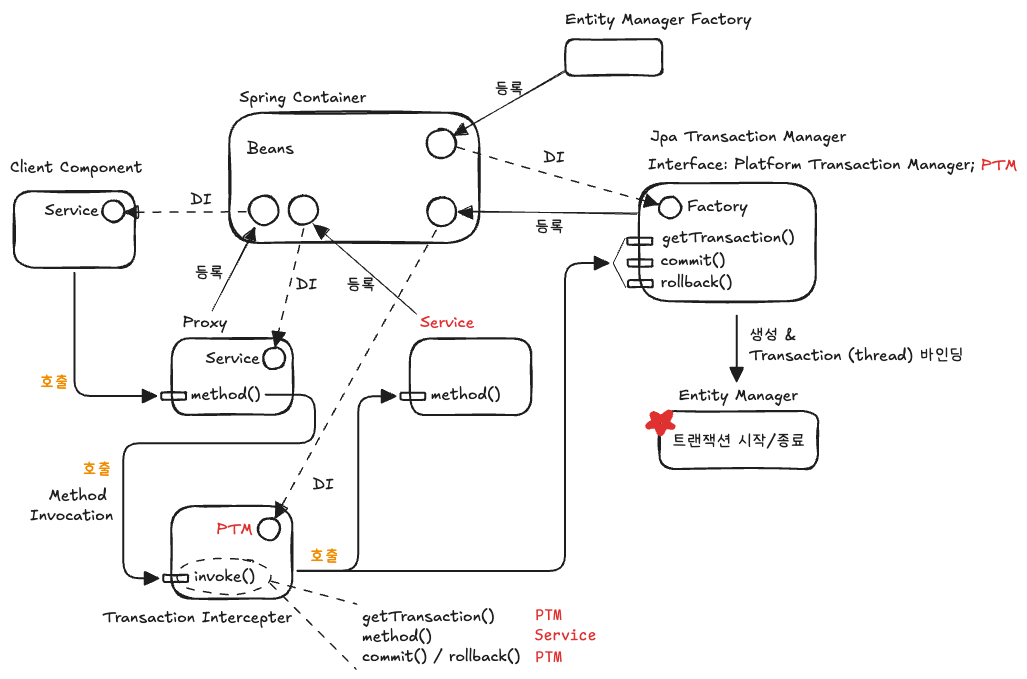 스프링 컨테이너는 애플리케이션의 핵심 객체들을 빈으로 관리합니다. 특히 트랜잭션 관리에서는: